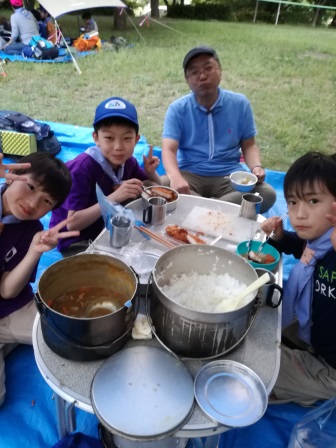 そして、出来上がった組から、夕食開始です。外で食べるカレーは、最高の味でした。