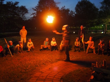 夕食後は、営火(キャンプファイヤー)です。今回、各組は、スカウトソングの替え歌を披露しました。うまく歌えた組も、不完全燃焼だった組も、楽しんでいました。