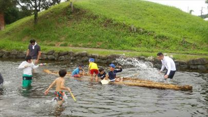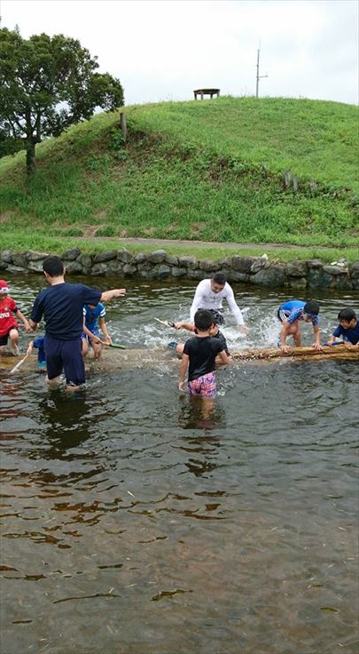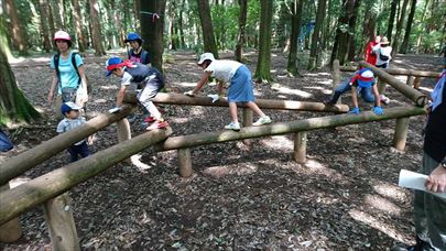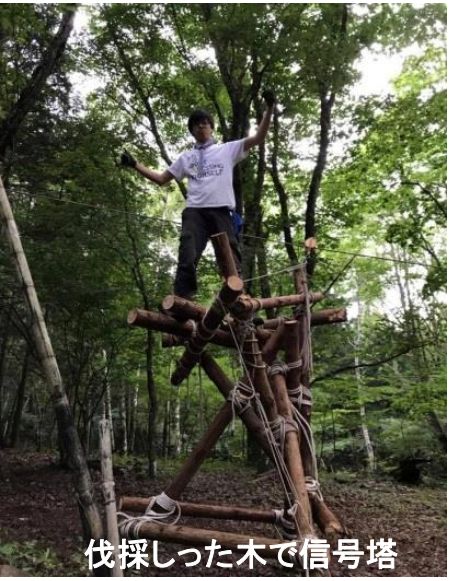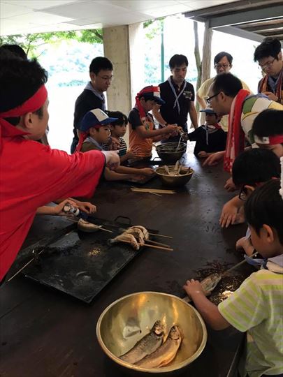 すずらん荘第一キャンプ場(山梨県笛吹市) 大雨の中、盛りだくさんのプログラムを実施。ニジマス釣り(魚をさばいて塩釜焼き)、伐採した木で信号塔つくり、 モンキーブリッジ、黒岳・釈迦ケ岳ハイキング、五右衛門風呂でくつろぐ・・・