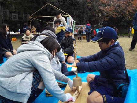 ガールスカウトに指導してもらって、火おこしにも挑戦します。手で火をおこすのは大変! なかなか成功しません。