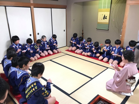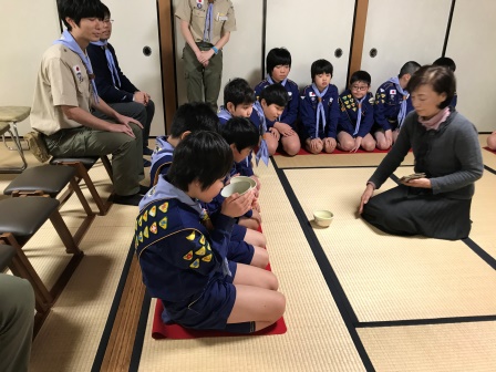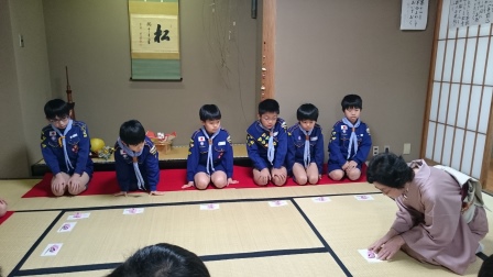 写経の他に、お茶会も開いて頂きました。文京5団のスカウトは、男子だけなので、このような日本文化に触れられるお茶の機会は、貴重な経験です。