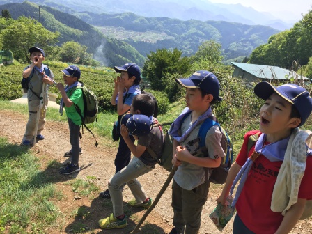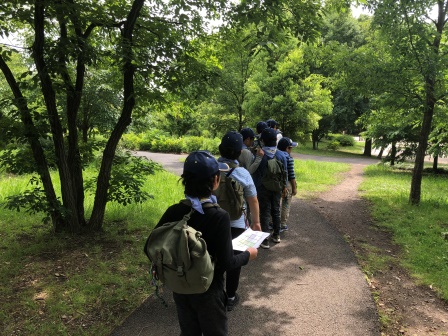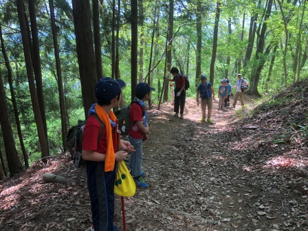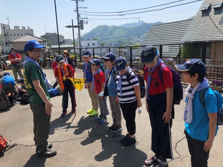 新しい組になって初めて本格的な野外活動!新しくメンバーに加わったうさぎスカウト(小学3年生)達は、くまスカウト(小学5年生)やしかスカウト(小学4年生)についていけるかな?報告した後、出発です。