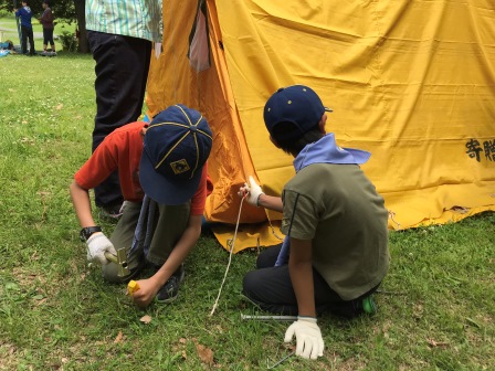 まずは今夜泊まるテントを設営します。くま、しか、うさぎスカウトが力を合わせて組み立てます。.jpg)