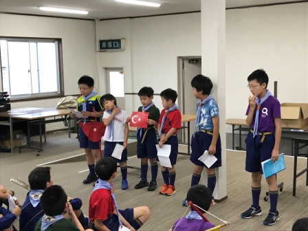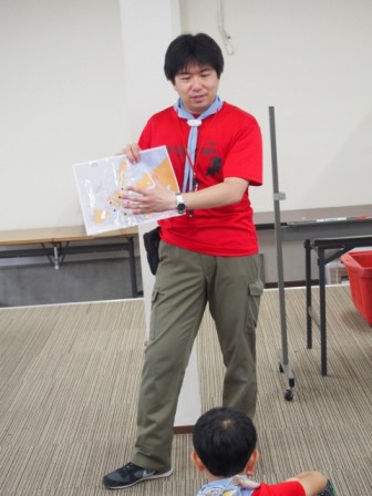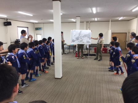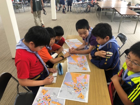 ゲームの地図版です。移動は組で話し合ったエリアをプロットして進めます。盤上の駒もスカウトの自作です。色とりどり!