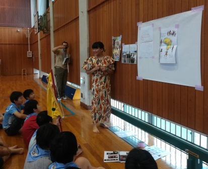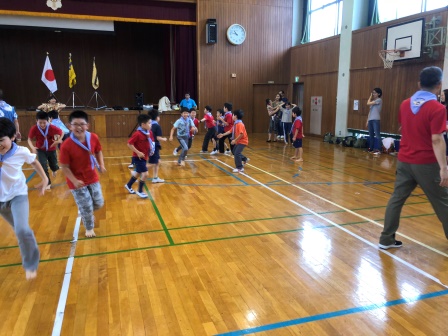 今回は、ジャンベというアフリカの太鼓のリズム(録音)に併せて、アフリカンダンスのいろんな踊りにチャレンジします。この日は保護者も参加し、ともに汗を流しました。