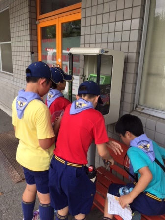 晴天で朝からぐんぐん気温が上がり、日中は31度を超え湿度もかなり高い状況下で、公衆電話オリエンテーリング集会が実施されました。