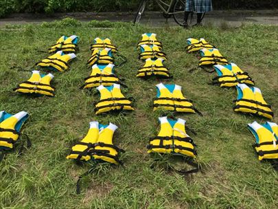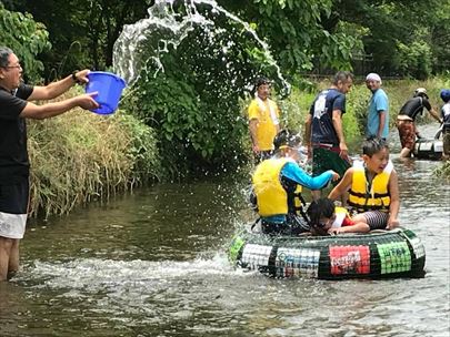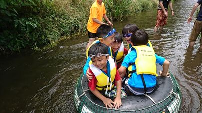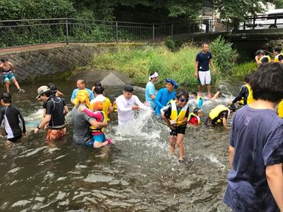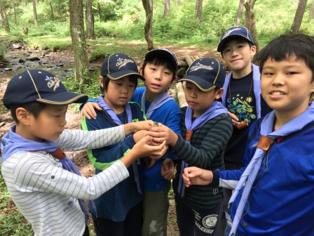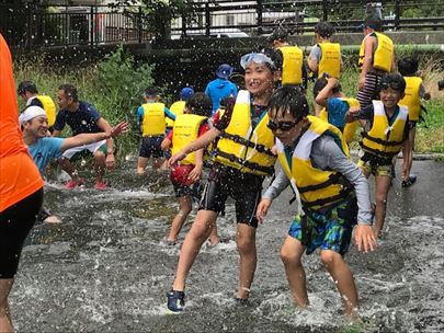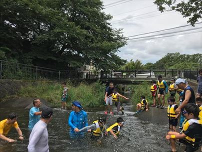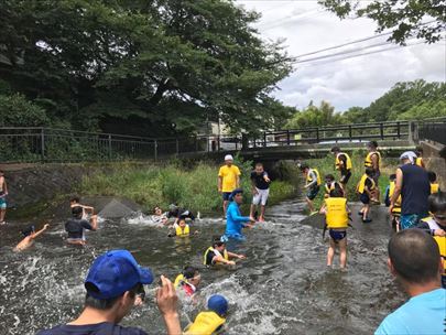 川遊び集会です。しっかり説明を聞いてから活動を開始します。