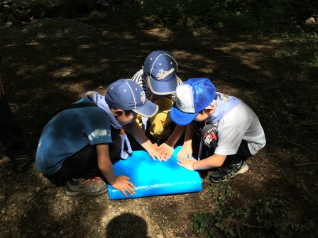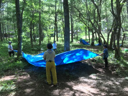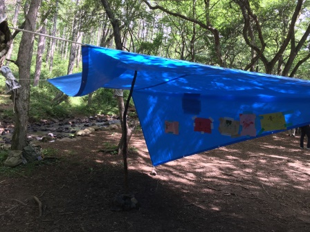 ブルーシートやロープ、枝などを駆使して作った「秘密基地」、各組の個性が伺えます。