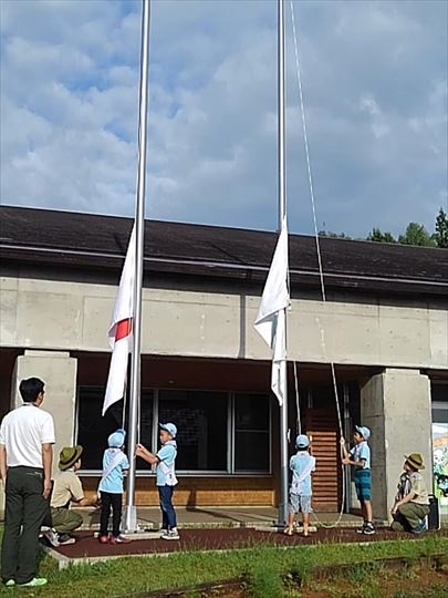 ビーバー年代がお世話になるのは青少年自然の家。今年は妙高にお世話になりました。朝の集いでは、国旗掲揚も担当します。