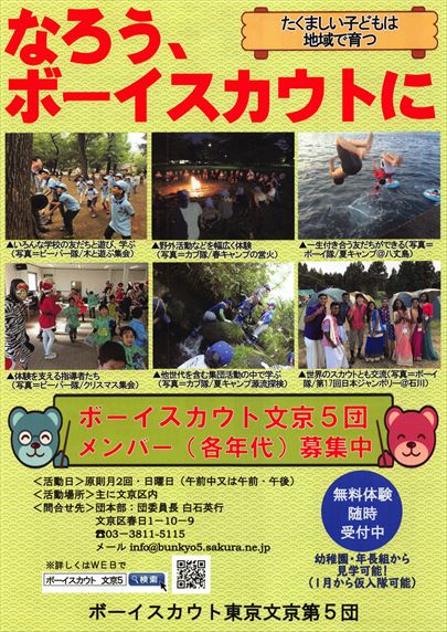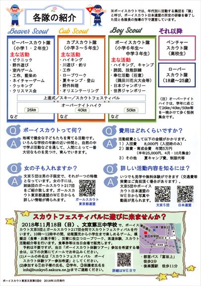 文京区内の一部小学校、幼稚園等にボーイスカウトの募集チラシを配布しています。