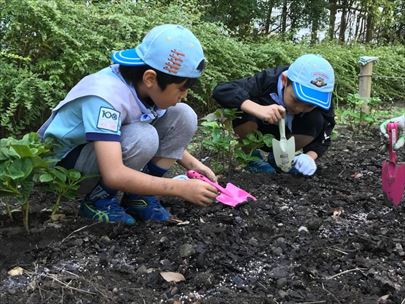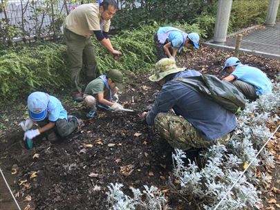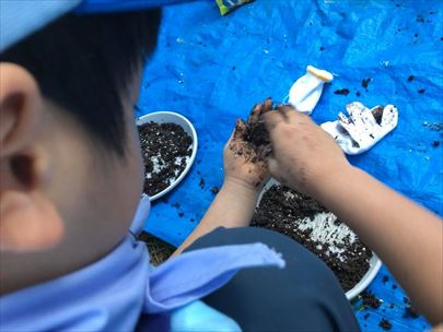 秋晴れの空の下、東京臨海広域防災公園で秋まきの種を植えました。職員の方の指導の下、お団子に練り込んでいきます。複数の種類の種が入っていて、3ー4月頃咲くそうです。