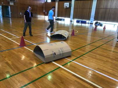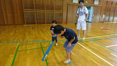 段ボールの中に入って移動、バットに頭をつけてぐるぐる回ってからのかけっこ、フラフープ通し、、学年を超えて一緒に楽しく全身を動かせる競技です。