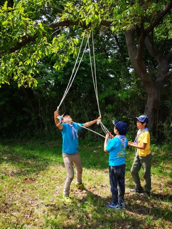 自然の中でロープを使って遊び始めたスカウトたち,まさにスカウトですね!